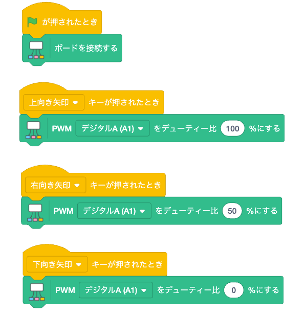 このサンプルプログラムはScratch互換環境「Xcratch」のAkaDako拡張ブロックを使用しています。拡張ブロックの使い方についてはこちらをご覧ください。