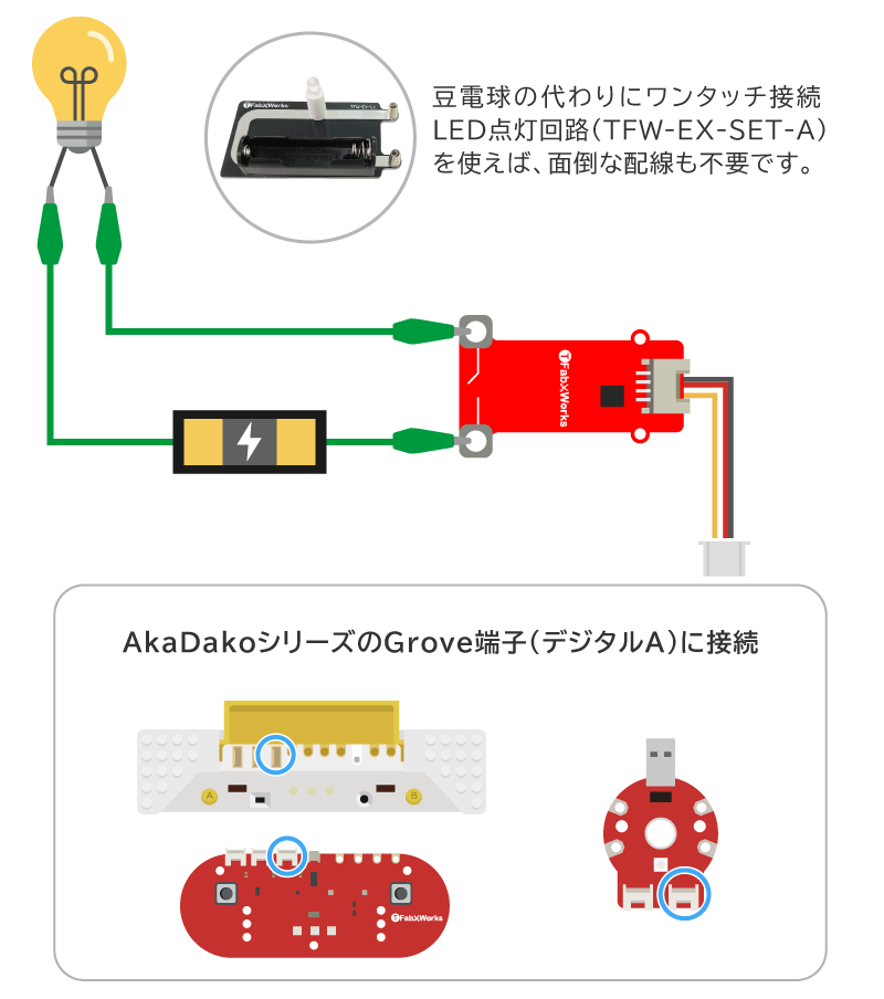 AkaDakoファミリーのGrove端子(デジタル)に接続できる制御スイッチです。制御スイッチを使用することで、外部の回路のON/OFFが行えます。PWM制御にも対応しているため、例えば外部接続したLEDの明るさやモーターの回転速度の調整も可能です。小学校6年理科「電気の利用」・中学技術情報/計測制御に最適です。